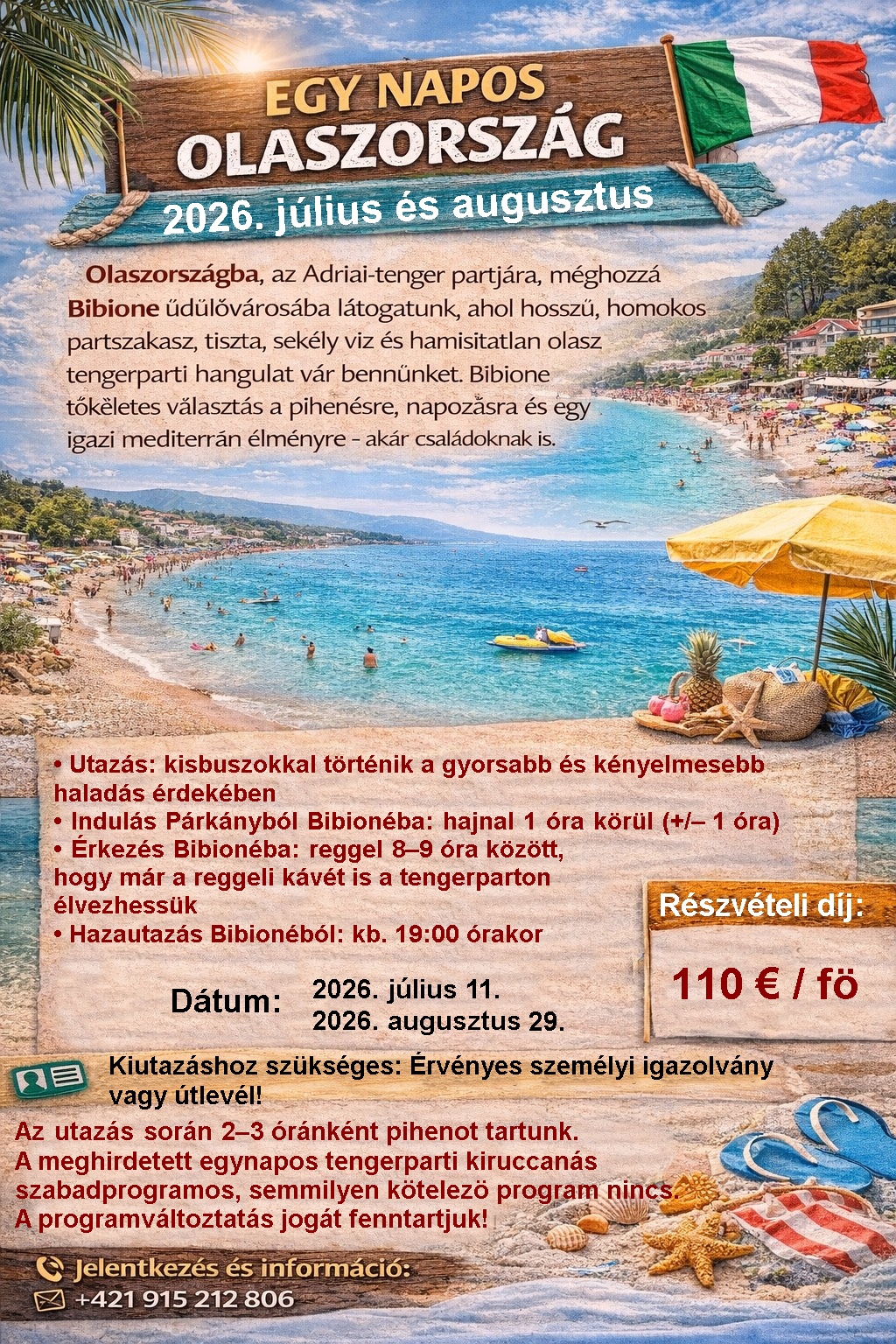 Olaszországba, az Adriai-tenger partjára, méghozzá Bibione üdülővárosába látogatunk, ahol hosszú, homokos partszakasz, tiszta, sekély víz és hamisítatlan olasz tengerparti hangulat vár bennünket. Bibione tökéletes választás a pihenésre, napozásra és egy igazi mediterrán élményre – akár családoknak is.